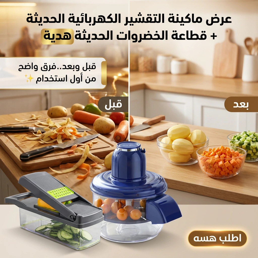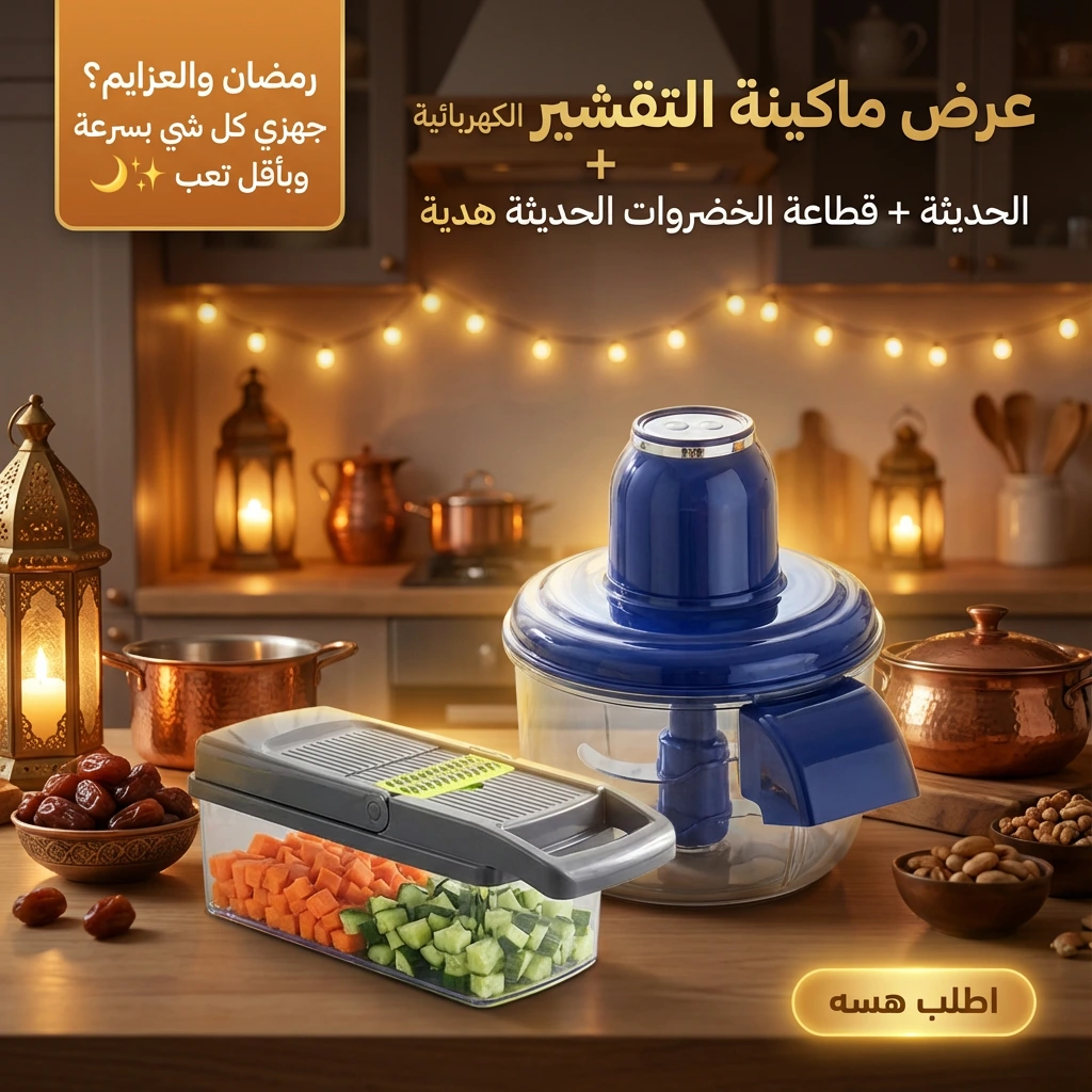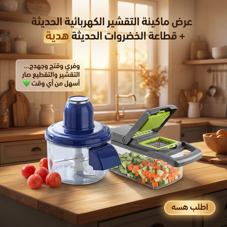 تحضرين للعزايم أو فطور رمضان وتعبتي من الوقفة؟ بدال ما تضيعين ساعات بالتقشير والتقطيع اليدوي، عرض المطبخ الذكي يختصر عليچ الوقت والمجهود. ماكينة التقشير الكهربائية تخلص البطاطس والفواكه بثواني بدون وجع إيد، والقطاعة الحديثة تحضر السلطات والطبخات بشكل مرتب واحترافي بدون أي فوضى.
